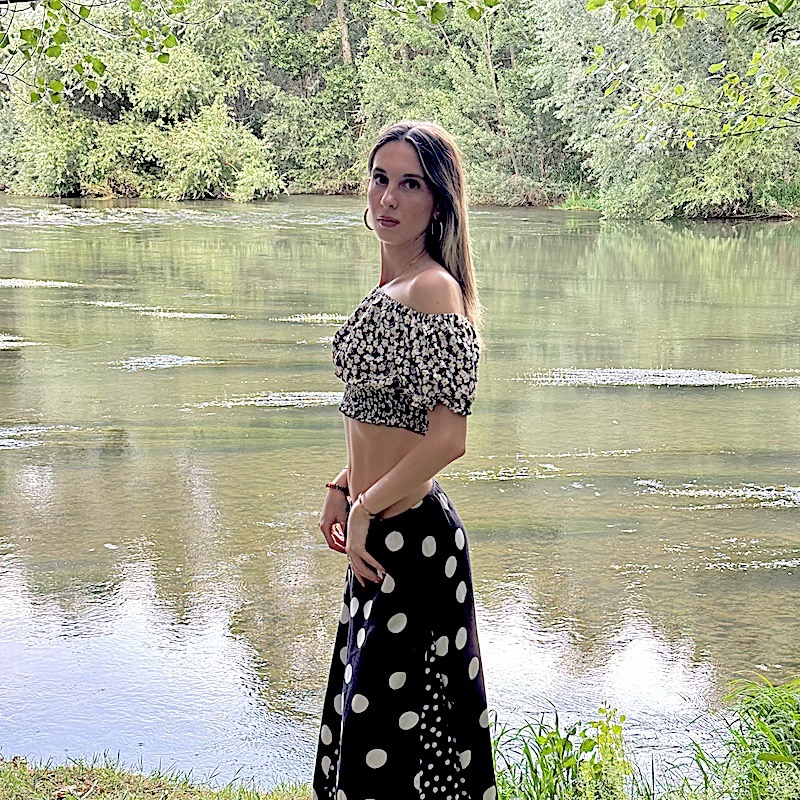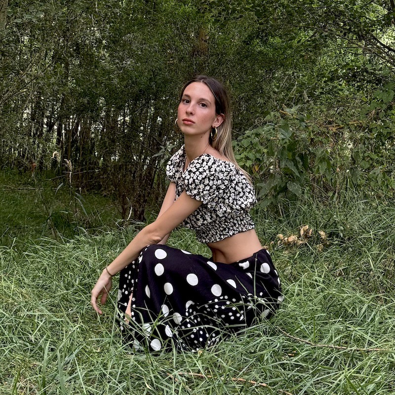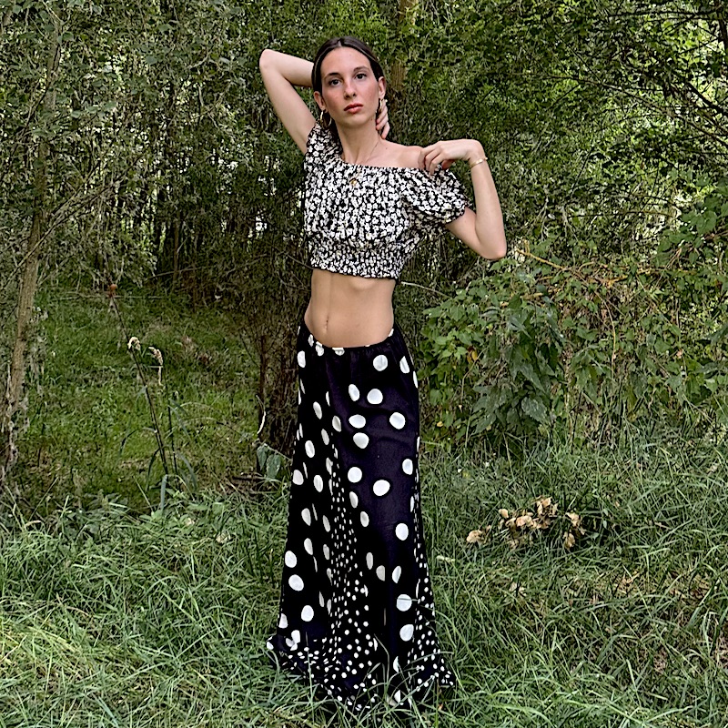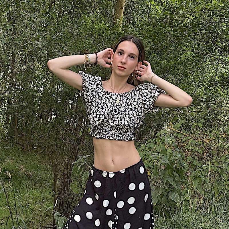 El top corto que proponemos es un blusa estilo crop con estampado de flores pequeñas en blanco y negro. Tiene un escote tipo bandeja u hombros descubiertos, con mangas cortas abombadas y un ajuste elástico tanto en la parte superior como en la inferior, lo que crea un efecto fruncido que realza la silueta. Es una prenda de estilo femenino y veraniego, ideal para combinar con faldas o pantalones de tiro alto.